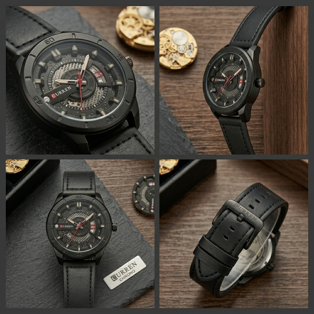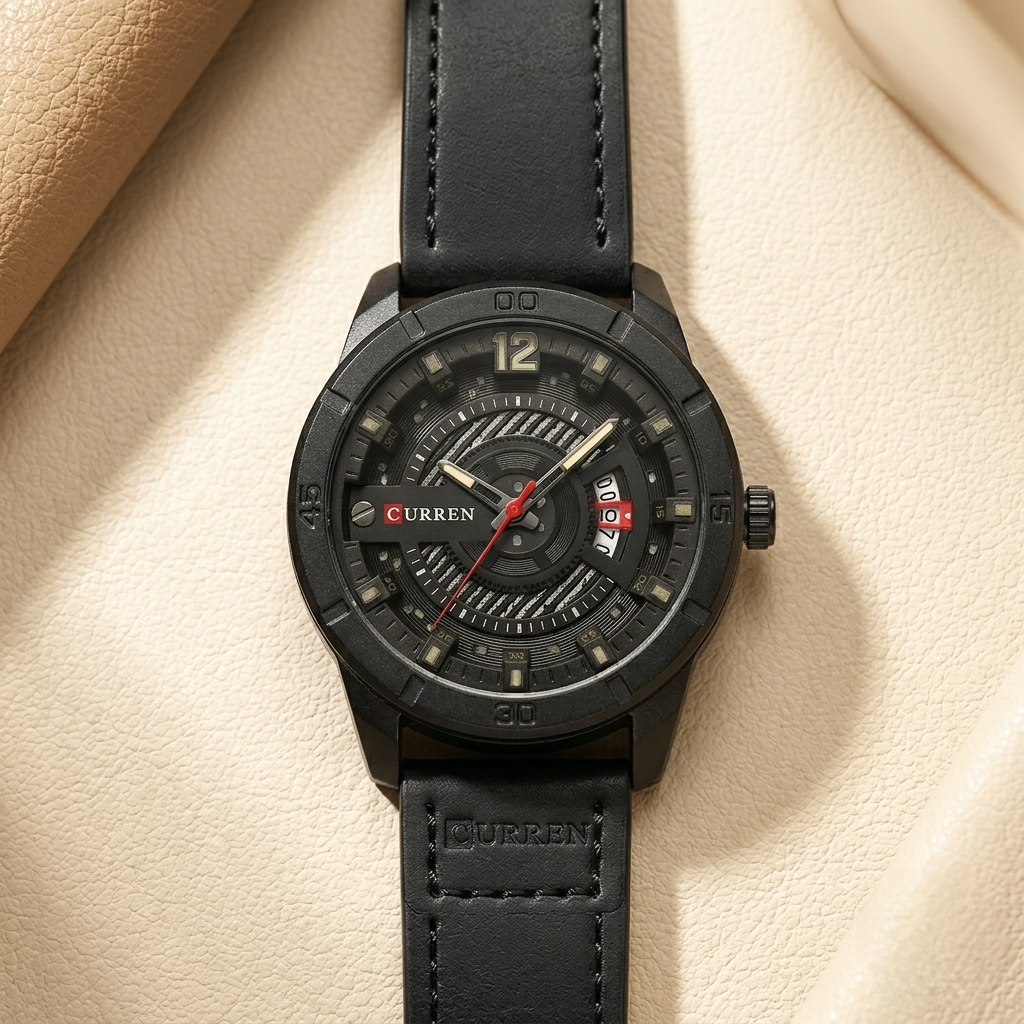 Built for the bold. This CURREN timepiece features a matte black oversized case with a deep-set, multi-layered dial inspired by precision machinery. With a rugged black leather strap featuring reinforced stitching and a unique vertical date display, this watch is designed for those who demand a high-performance look with an edge.