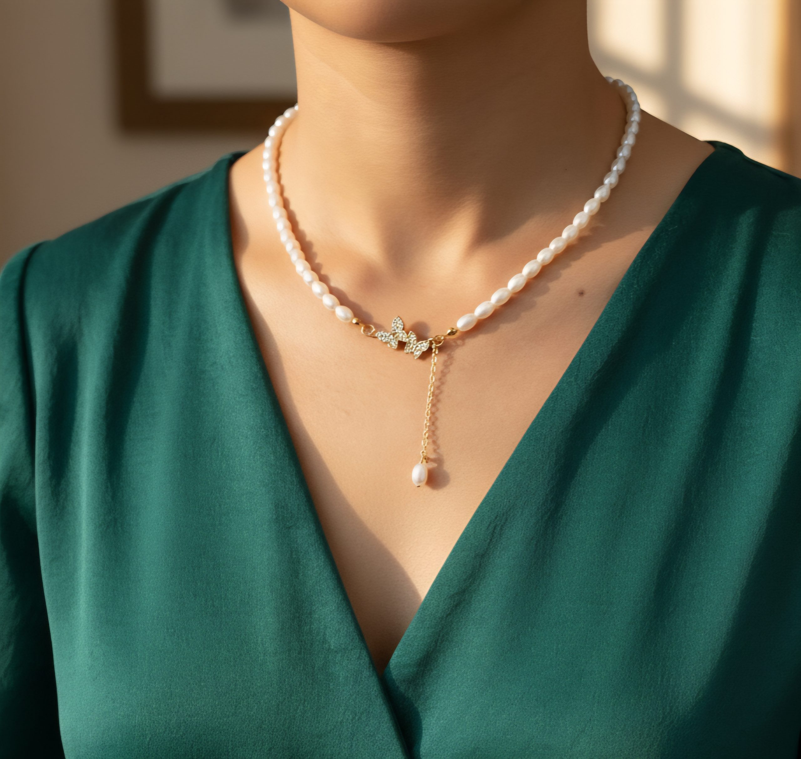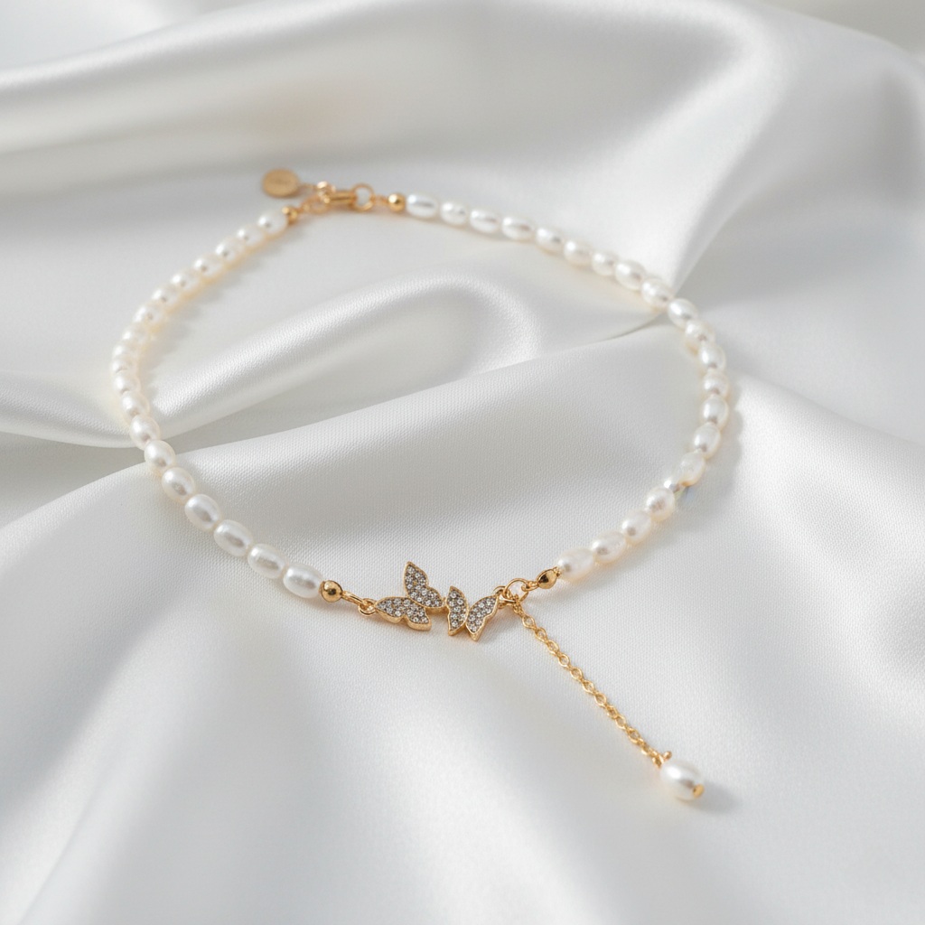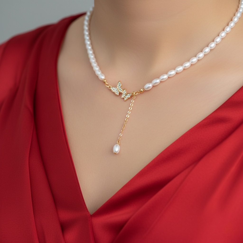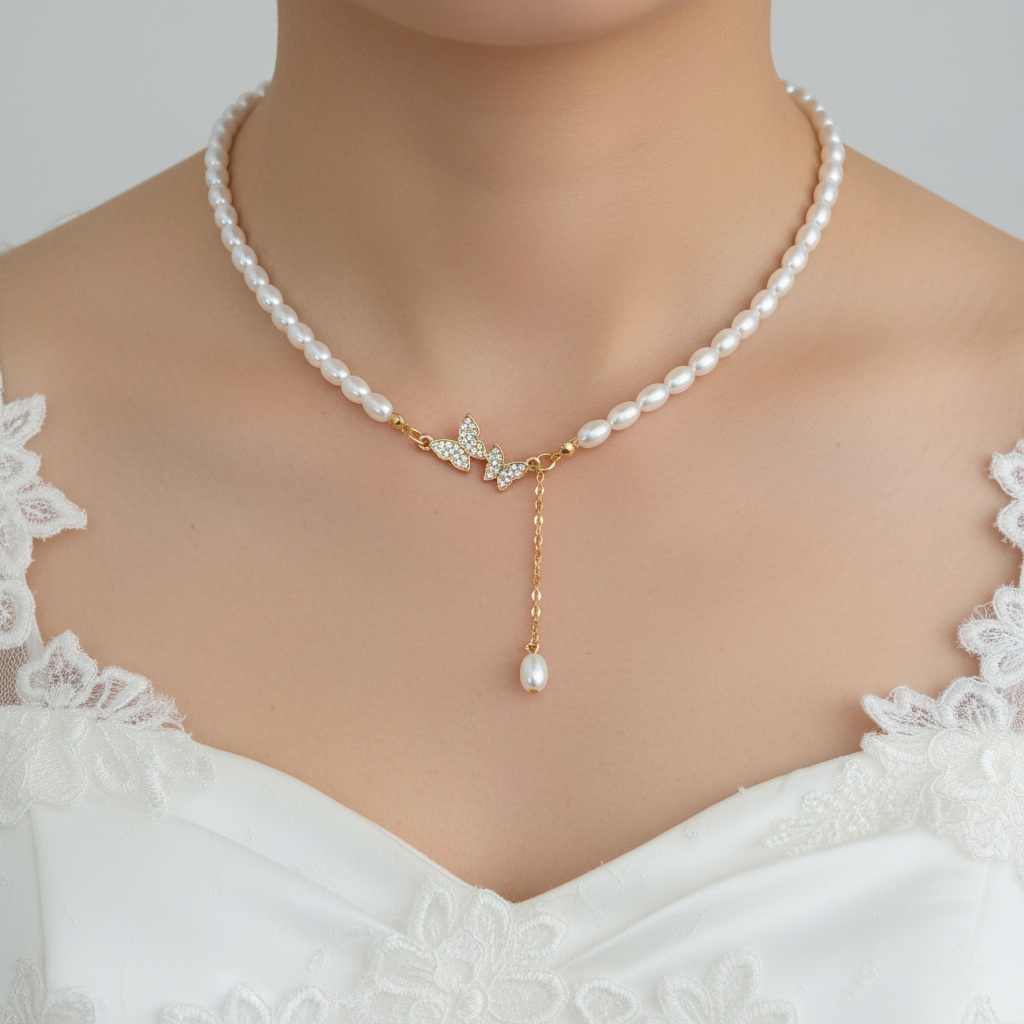 Designed with glossy beads and a dazzling butterfly motif, this necklace offers a modern yet feminine look with a subtle hanging charm.