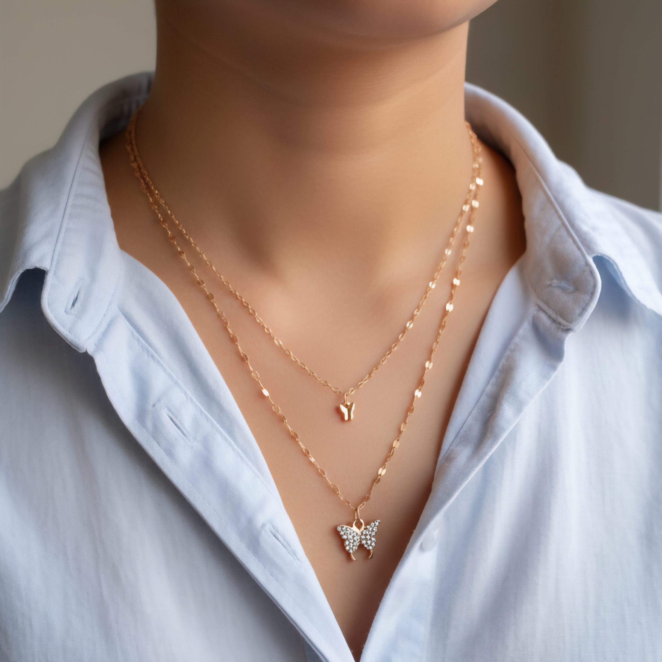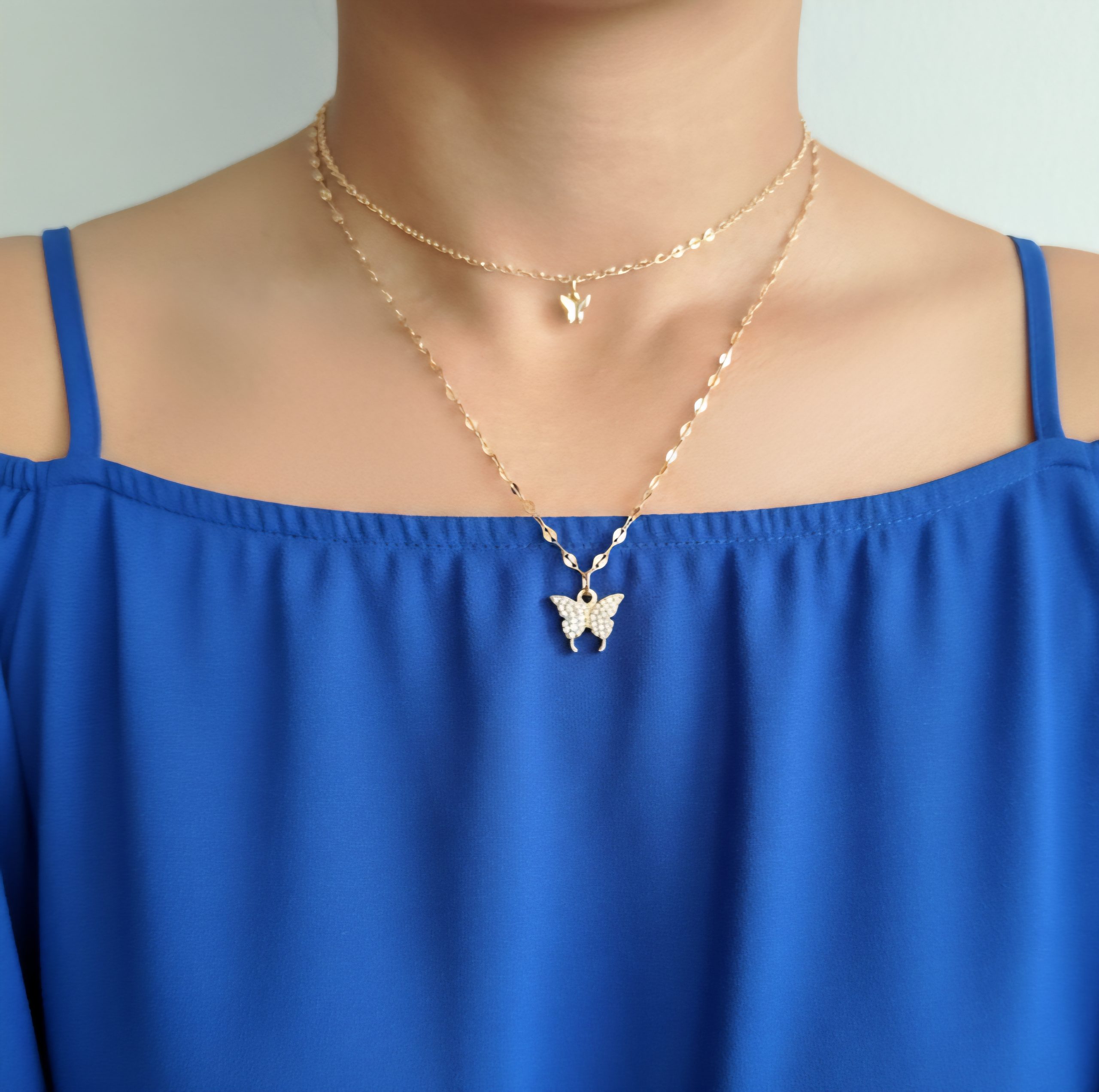 Gold Layered Butterfly Necklace – 2-Piece Dainty Crystal Pendant Set