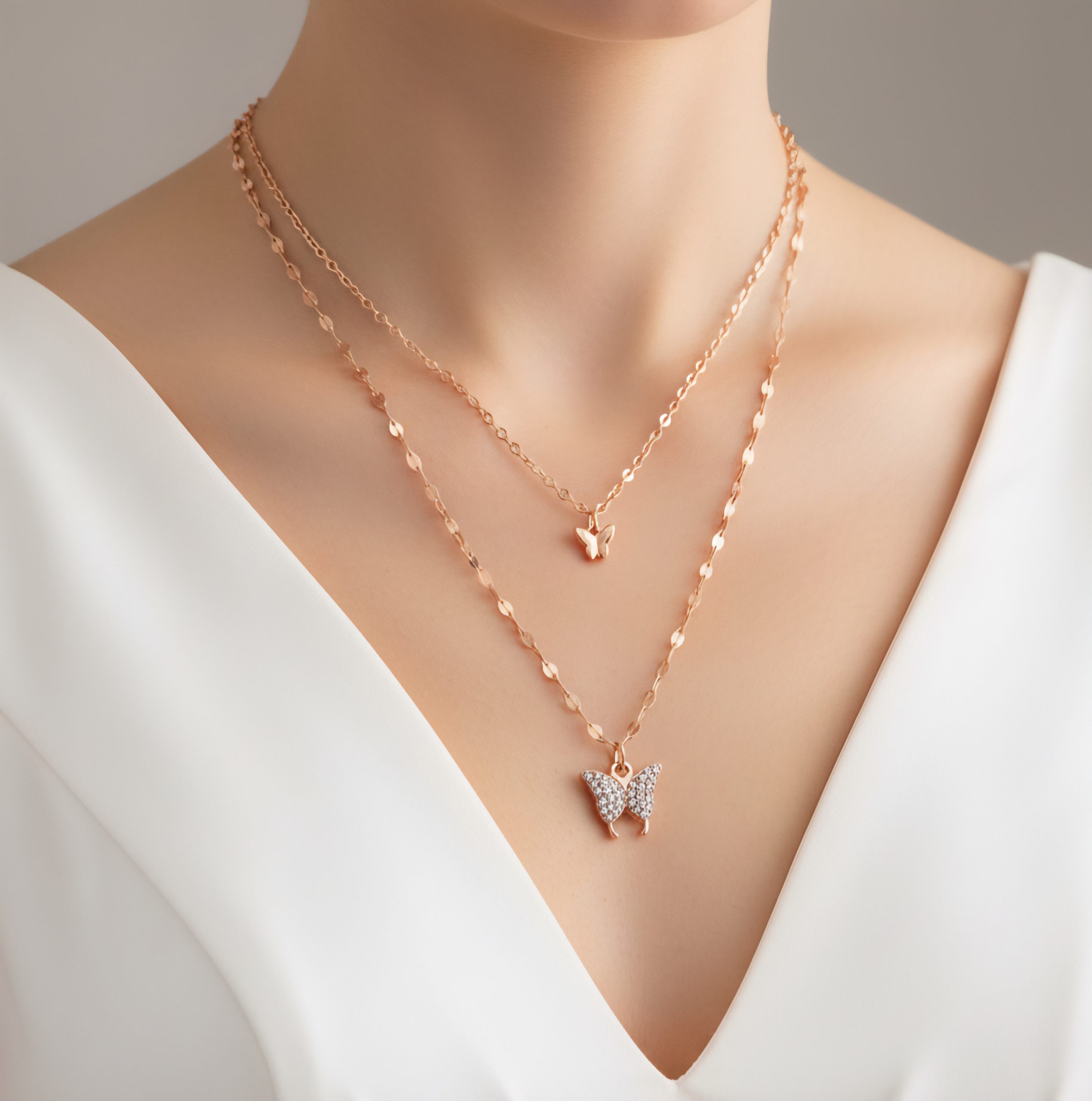 Effortless layering in a warm, rose gold finish. This dual-chain necklace features a delicate cable chain with a polished butterfly and a second, textured “glint” chain that catches the light with every move. It’s the perfect subtle statement piece for a sophisticated everyday look.