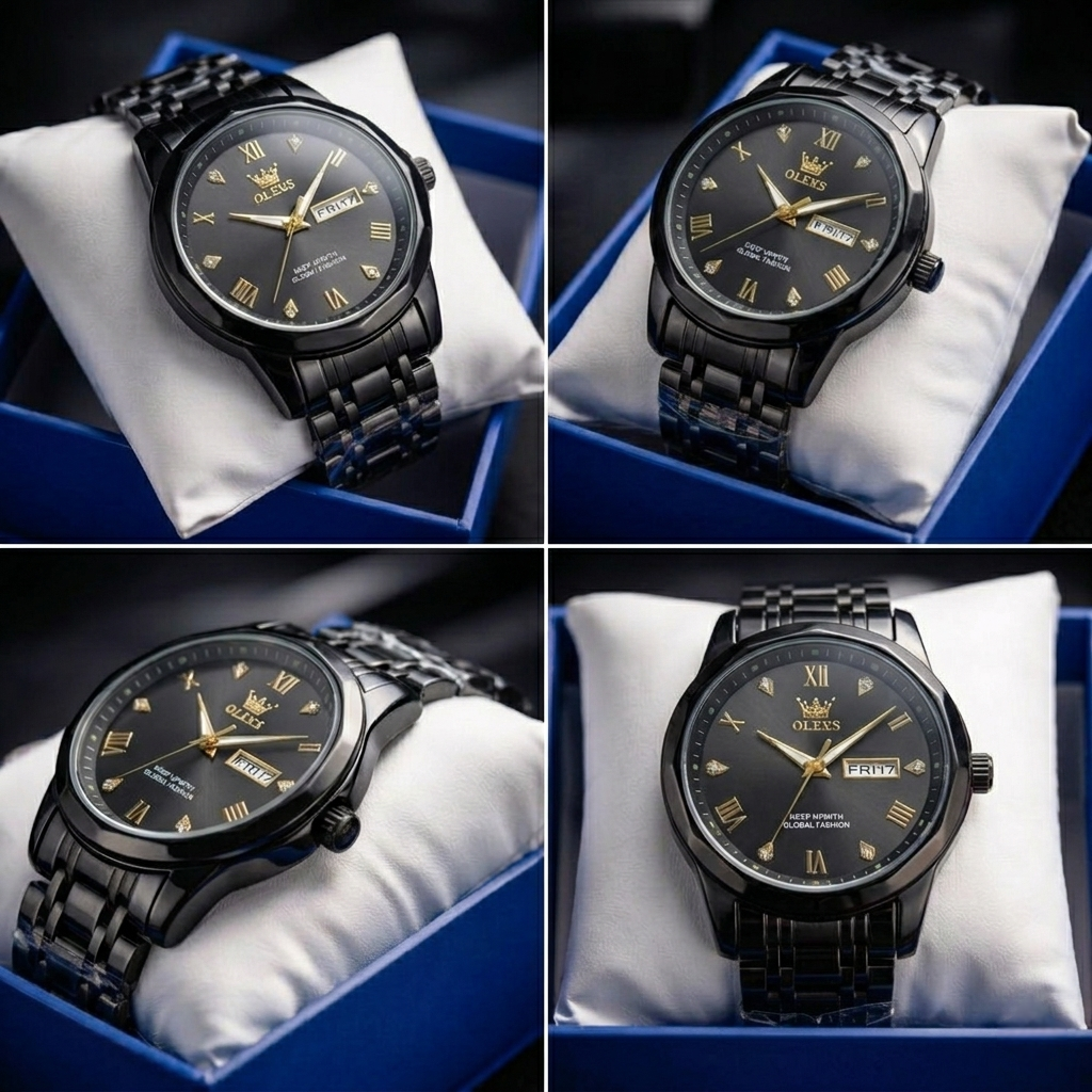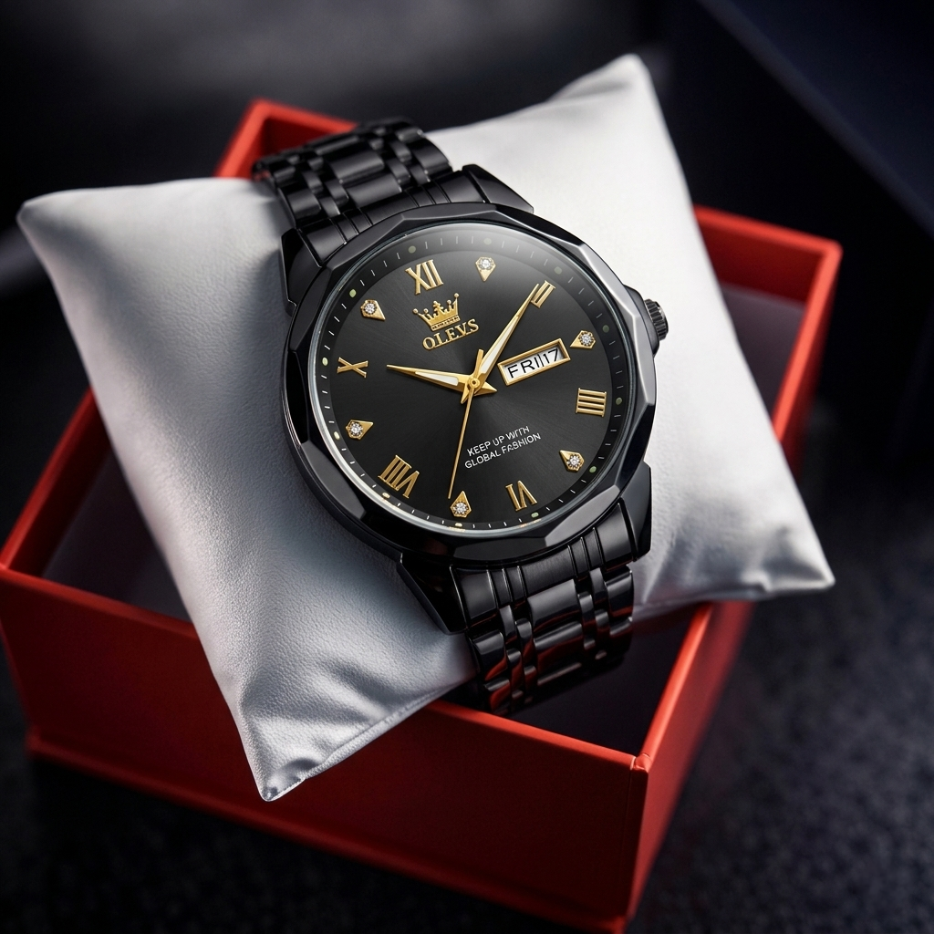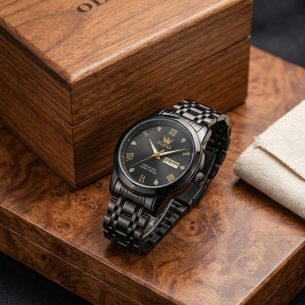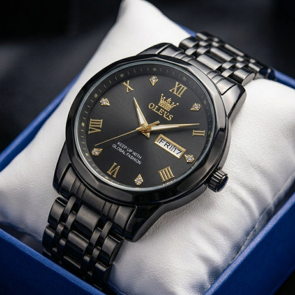 OLEVS Regal Crown Series – All-Black & Gold Men’s Watch