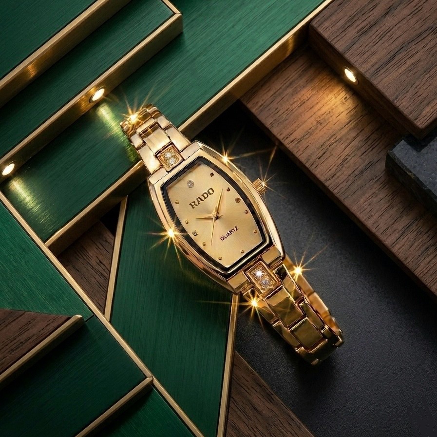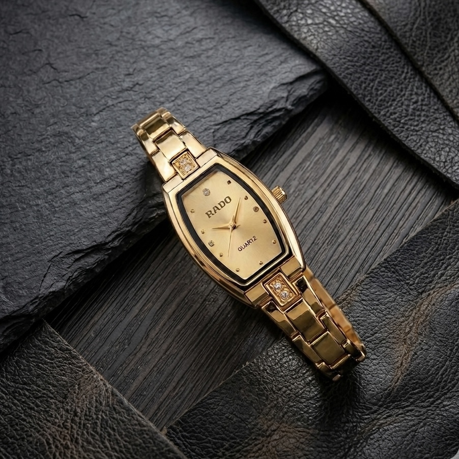 A timeless expression of grace and luxury, this gold designer watch features a refined slim dial paired with a polished bracelet strap. Its minimalist yet luxurious design makes it an essential accessory for any stylish woman.